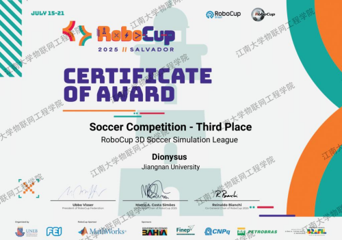 NewsRecently, the 2025 RoboCup Robot World Cup was successfully held in Brazil. The Dionysus team from the School of Internet of Things Engineering secured third place in the 3D Soccer Simulation category, matching the best result achieved by a Chinese university team in this division over the past decade.