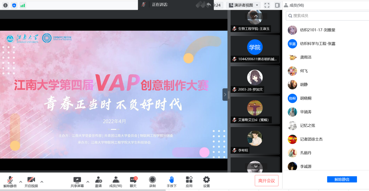 近日,为喜迎党的二十大,携手奋进新征程,在五四青年节来临之际,由校党委宣传部、共青团ok138cn太阳集团委员会、ok138cn太阳集团529联合举办的“青春正当时,不负好时代”ok138cn太阳集团第四届VAP创意制作大赛决赛在线上成功举行。ok138cn太阳集团529党委副书记、副院长孔丽丹,校党委宣传部网络思政与宣传科科长张铁根,ok138cn太阳集团529分团委书记洪筱,ok138cn太阳集团529辅导员王志顺、王雪冰、屈跃宽、沈滔出席本次活动并担任评委。