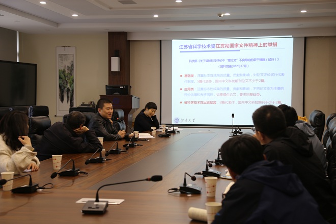 会上,范大明首先从科技奖励总体介绍、申报书的填写、需重视的问题、汇报答辩的结构几个方面,对科技奖的申报流程及要求等做了政策上的解读。2020年江苏省科技奖一等奖获得者王艳教授从选题、理念、内容等角度分享了申报经验。会议交流环节,与会人员围绕申报准备阶段存在的困难和问题展开了交流,王维懿进一步解读了申报政策,大家集思广益、相互启发,为申报奖项提供思路。