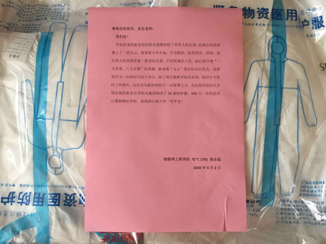 新冠肺炎疫情暴发以来,广大物联学子时刻心系母校。近日,为积极配合学校做好复学准备工作,全力保障开学后我校师生的健康和安全,电气1701班的郁金蕊同学无偿为母校捐赠30套防护服和500只一次性医用口罩,用自己的实际行动为母校的疫情防控工作助力。