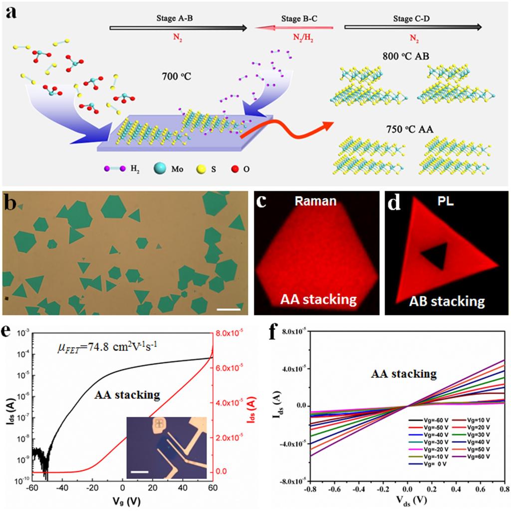 “我们提出的一种具有普适性的氢气辅助反向气流化学气相外延法,通过在升温阶段引入氢气反向气流并控制生长温度梯度,不仅有利于减少外延生长时不需要、不可控的成核中心,而且有利于源自第一单层成核中心的第二单层的均质外延。”肖少庆说,这种方法的效率远超机械剥离法和传统的CVD方法,并在三层及多层单晶的逐层可控制备方面展现出巨大的潜力。同时,通过控制第二层的生长温度可以得到不同堆垛的双层TMDs单晶如AA堆垛和AB堆垛的二硫化钼(MoS2)。实验结果发现AA堆垛的双层MoS2具有比单层更高的场效应管迁移率;通过采用多种源粉首次合成了MoWSSe四元合金双层单晶,实验结果表明其场效应晶体管表现出明显的双极性特征。