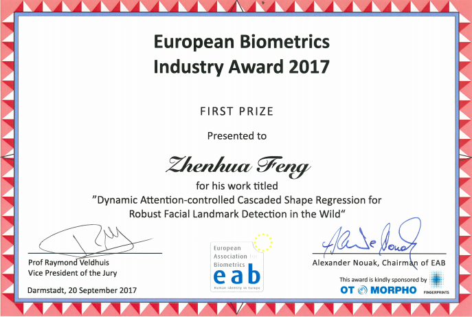 9月20日,欧洲生物特征识别协会(European Association for Biometrics, EAB)在位于德国达姆斯塔达的弗劳恩霍夫图像数据处理研究所举办了2017年欧洲生物特征识别研究与工业奖(European Biometrics Research and Industry Awards)的颁奖典礼,我校ok138cn太阳集团529模式识别与计算智能国际联合实验室的博士后研究人员冯振华喜获2017年欧洲生物特征识别工业奖(European Biometrics Industry Award 2017)。