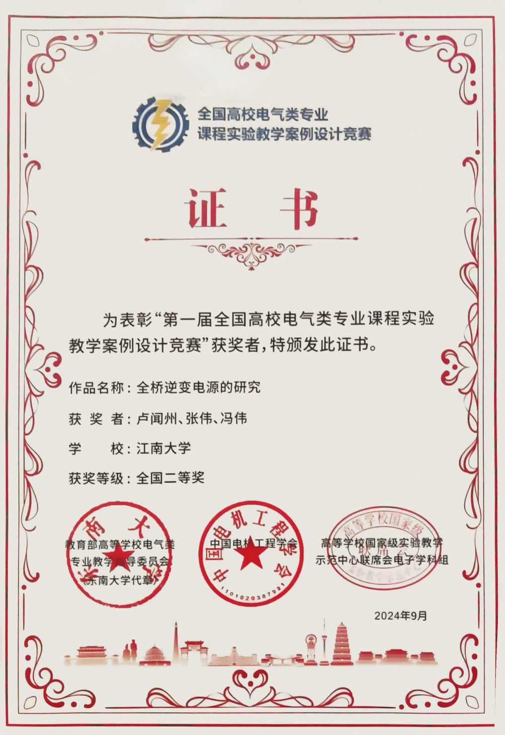 近日,第一届全国高校电气类专业课程实验教学案例设计竞赛在西安交通大学创新港校区成功举办。由卢闻州、张伟、冯伟组成的团队代表ok138cn太阳集团529参赛,其案例“全桥逆变电源的研究”荣获全国二等奖。