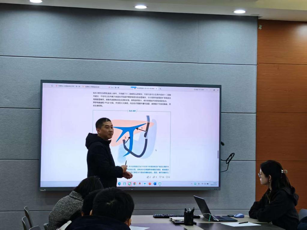 会议尾声的 “头脑风暴” 环节气氛热烈,成为医工协同的核心亮点。针对 EUS-BD(超声内镜引导下胆道引流术)等复杂术式,与会人员围绕解剖结构特点、器械操作路径展开细致推演,通过电子白板实时绘制示意图,从力学结构优化、穿刺路径精准规划、机器人功能设计等多个维度,深入探讨现有器械与手术流程的升级方向。医工双方各抒己见、频频互动,就多个技术难点的解决方案达成初步共识,为后续合作攻关明确了具体方向。