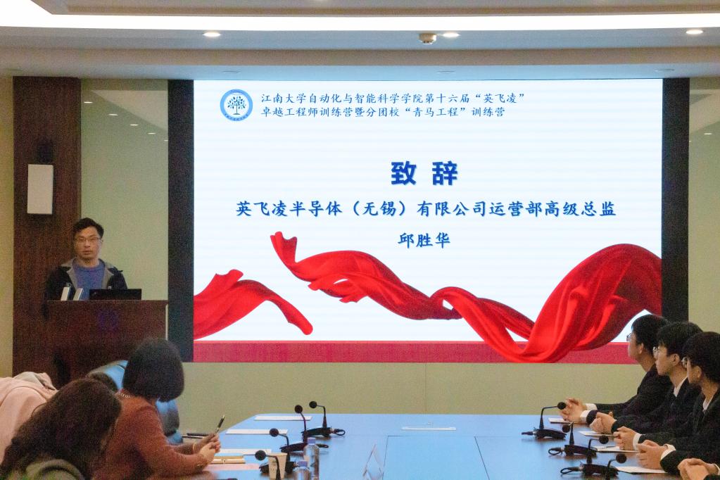 首先,邱胜华代表英飞凌半导体(无锡)有限公司为开营仪式致辞。他表示,校企双方十六载携手同行,在持续深化交流、推进务实合作的过程中,不仅共同见证了彼此的成长与发展,更结下了深厚的信任与深厚情谊。展望未来,他希望双方能够进一步深化产学研融合,携手培养更多德才兼备的卓越工程师,为行业发展注入新生力量。