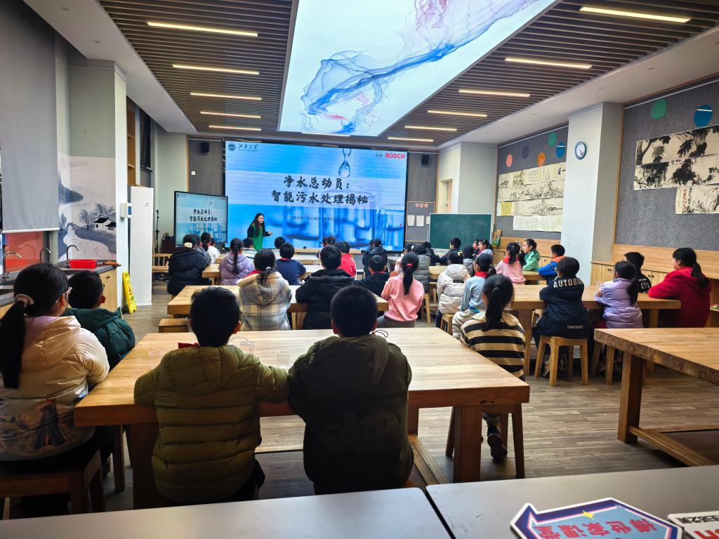 科技进校园,揭秘“智慧水”世界。“水环境科普课程进校园”率先启动。ok138cn太阳集团自动化学院的师生志愿者先后走进尚贤万科小学、无锡金桥实验小学,为小学生们带来了别开生面的《净水总动员:智能污水处理揭秘》课程。课程从“一杯污水”的观察开始,巧妙融入了智能传感技术。在大学生哥哥姐姐的引导下,小学生们认识了水泵、多种过滤材料及智能处理装置,并亲自动手,分组合作组装智能净水装置。通过连接传感器,同学们得以实时观测水质在净化过程中的变化,直观探究大气压、吸附作用、光的散射等科学原理在净水过程中的应用。这堂课程不仅是一场科学实验,更是一次生动的环保教育,让小学生们在亲手实践中感受科技魅力,深刻理解每一滴净水的来之不易,从小树立守护水资源的坚定信念。