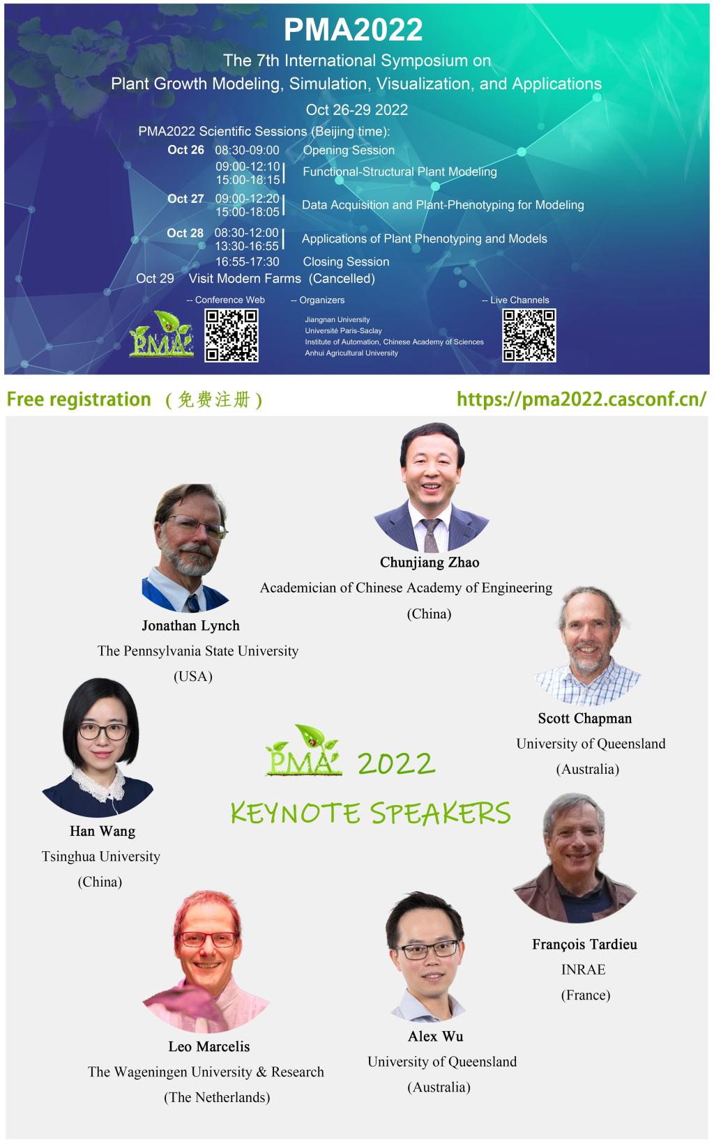 第七届植物生长建模、仿真、可视化与应用国际研讨会(PMA2022)将于2022年10月26日-29日以线上的方式举行。PMA2022由ok138cn太阳集团、法国巴黎萨克雷大学、中科院自动化所、安徽农业大学联合举办,会议报告采取全英文的方式,全球直播。作为一个国际平台,PMA2022汇集了来自全球各地的杰出科学家,讨论与探索植物模型的前沿科学技术,包括从分子到生态系统尺度的建模理论、计算算法、模拟技术和可视化方法等,以推进生命科学、计算机、物联网、自动化等学科交叉,促进农业智能化与可持续发展。