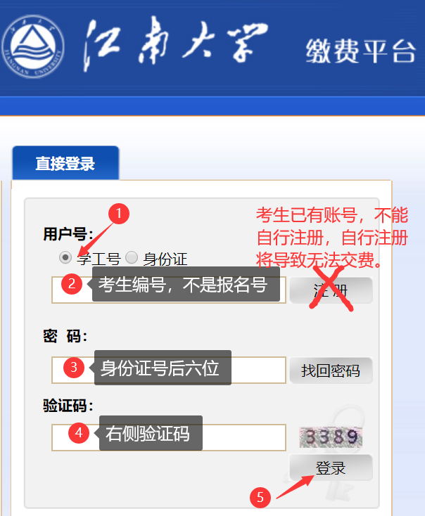 4、缴费说明:进入复试考生在学院规定的时间内登录“ok138cn太阳集团缴费平台”交纳复试费用,复试收费标准:80元/生。缴费网址:http://pay.jiangnan.edu.cn/payment/。登录账号为准考证上的考生编号,登录密码为身份证后六位(友情提醒:考生账号已开通,切勿自行注册)。按照提示交费(使用网银),并打印或截图保存付费凭证。