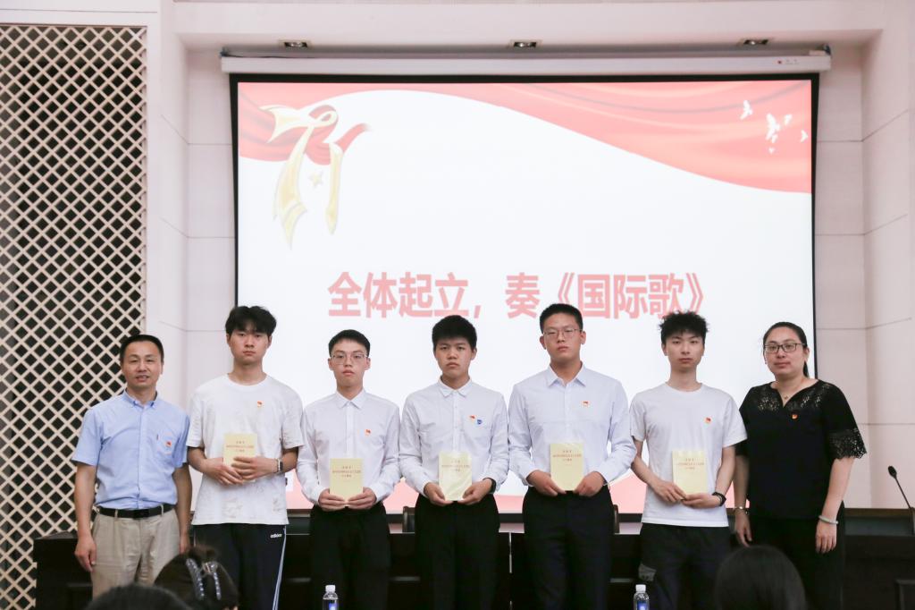 宣誓仪式在雄壮的《国际歌》中拉开序幕。耿向阳、孔丽丹为新党员代表佩戴党员徽章并赠书。随后,在孔丽丹的带领下,45名新党员右手握拳,面向党旗庄严宣誓,在场的老党员代表也一同重温了入党誓词。八十字的誓言字字铿锵、句句振奋,铮铮誓言传递着每一名党员坚定的信念和为共产主义事业奋斗终生的决心。