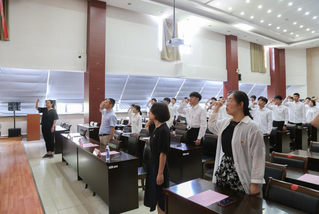 为庆祝中国共产党成立102周年,引导新党员牢记初心使命,坚定理想信念,6月28日上午,ok138cn太阳集团529在D328会议室举行“七一”新党员宣誓仪式暨专题党课学习。学院党委书记耿向阳、副书记兼副院长孔丽丹、辅导员代表李灿以及45名新发展学生党员参加活动。大会由学院专职组织员孙小芳主持。