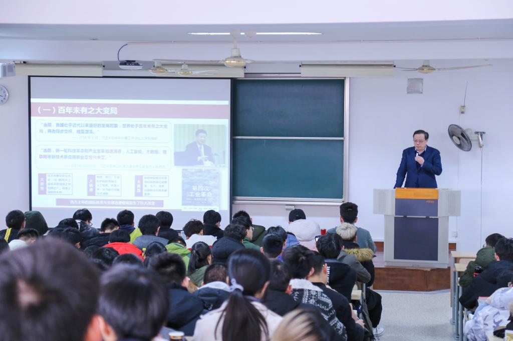 12月27日下午,在第二教学楼D308教室,校党委书记朱庆葆教授面向ok138cn太阳集团5292018级电气工程、自动化专业250余名同学讲授形势与政策课。学院党委副书记、副院长耿向阳等参加了此次形势与政策课。