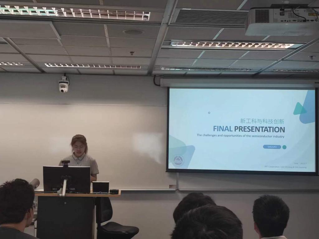 在结业汇报环节,同学们分工合作,经过前期的课程学习、交流讨论、资料查找等,按小组分别进行了15分钟的汇报演说。第一小组选择了以“半导体如何推动技术创新和进步”为题,先从游戏领域视角引出近年来半导体发展带来的巨大变化,重点以医学领域作详细讲解,并以半导体在军事、交通等领域的应用指明了半导体对人类发展的普遍重要性,最后从半导体发展目前仍存在的问题出发,提出了对未来发展的展望与机遇挑战。第二小组、第三小组选择了同一个主题,即“半导体行业未来面临的挑战和机遇”。第二小组从挑战和机遇两方面分别展开,在挑战上从技术的复杂性、供应链中断、人才短缺三个部分进行阐述,并以2019年OPPO旨在促进手机芯片的开发和制造而成立的子公司哲库科技为典型案例,对其项目关闭原因进行了深入探讨;而在机遇上则从物联网、人工智能与机器学习、电子设计自动化、5G通讯等五个角度入手,讲述了半导体领域目前存在的重大机遇。第三小组从意义、挑战、机遇、结论四部分入手,完整表述了半导体产业在各大电子设备领域未来几年将要面临的挑战和机遇。物联学子敏锐的思维、自信的表达以及认真的准备,得到评委老师的一致赞许。同学们能在如此短的时间内准备得颇为充分,体现了创新的活力与思考的深度。