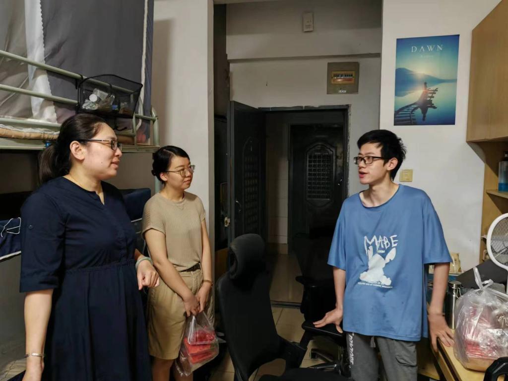 在学生宿舍,学院领导亲切与学生沟通交流,仔细询问同学们的学习规划和留校生活情况,倾听学生需求与心声,对同学们在假期里潜心科研、备战考研的刻苦精神表示肯定与赞扬。孔丽丹结合近几年的考研形势,建议同学们合理选定目标高校,掌握有效的学习方法,作息规律、张弛有度,心怀期许、得偿所愿。针对低年级留校同学,她建议做好学业生涯规划,利用暑期时间多探索、多感悟、多实践,可以走进学院大创基地体验学科竞赛的魅力,也可以走出校门融入社会大课堂。同时,还强调了关于暑期留校的各项要求,提醒同学们提高安全防范意识与自我保护意识。
