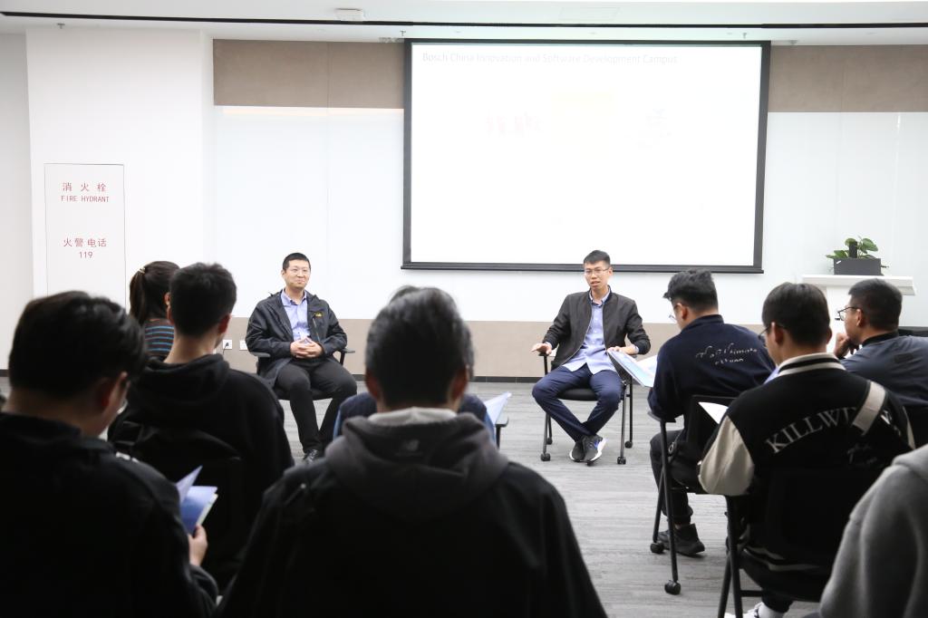 校友交流环节是本次活动的重头戏。毕业于ok138cn太阳集团529的校友代表陈家乐、段飞腾分享了自己的求职经验、在博世的工作体验和行业发展趋势,并与学生就自动驾驶、智能座舱等方面进行了技术交流探讨,让学生们更加真实地感受到企业的工作环境和就业前景。学生们也积极与学长交流,提出了自己在专业学习、职业发展等方面的问题,获得了专业的指导和建议。