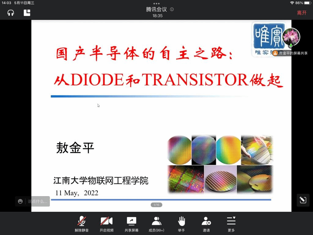 敖金平教授报告的题目是《国产半导体的自主之路》。他围绕专业知识,由浅入深地介绍了半导体,特别是宽禁带半导体的基本原理和器件,通过具体实例向同学们生动讲述宽禁带半导体在光电、电力电子、微波通信和无线充电等新型电子领域的相关成果和应用,并给出自主发展宽禁带半导体的方法和方向。