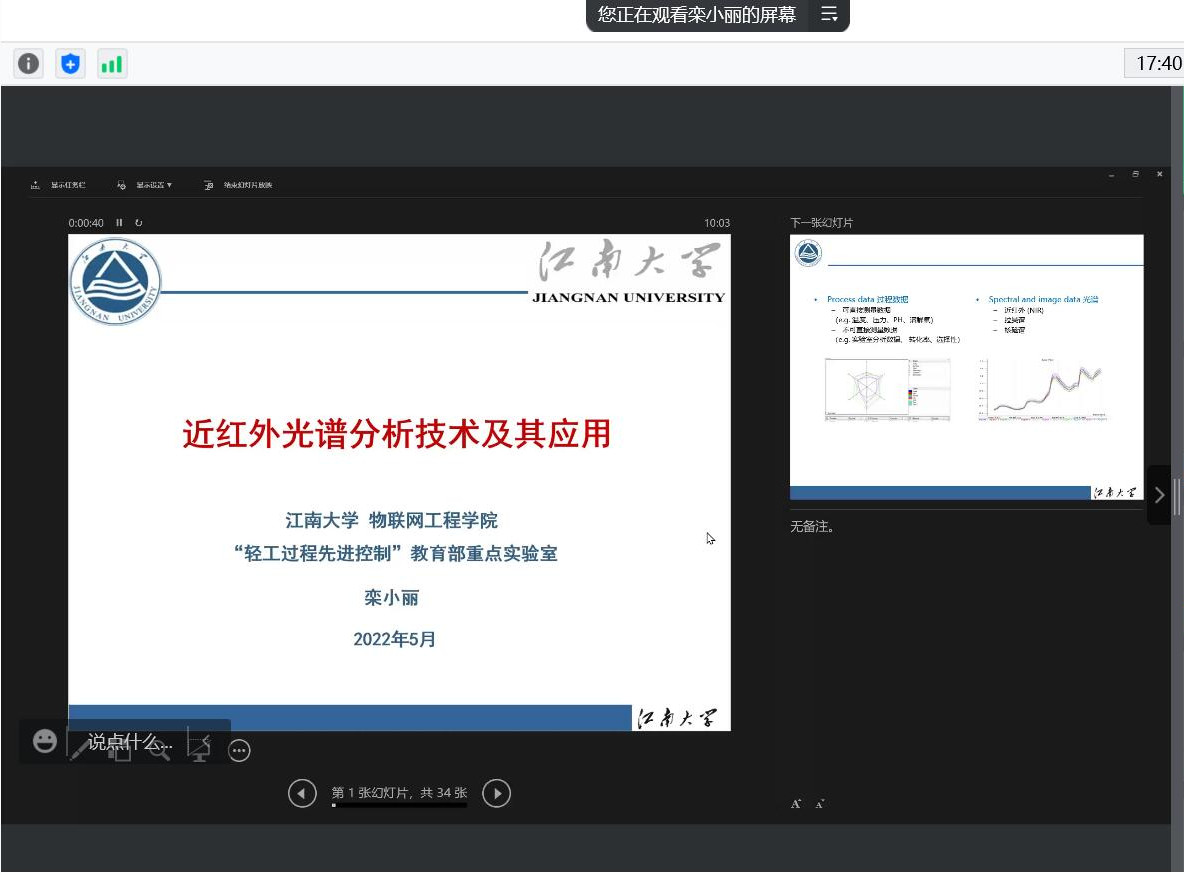 栾小丽教授以《近红外光谱分析技术及其应用》为题进行分享。她运用生动鲜活的例子深入浅出地讲解了近红外光谱仪的工作原理、常用的建模方法以及近红外光谱分析技术在生物、食品、化工等方面的应用,并就其团队近年来在近红外光谱分析技术中的典型应用进行介绍,对其发展趋势进行了展望。