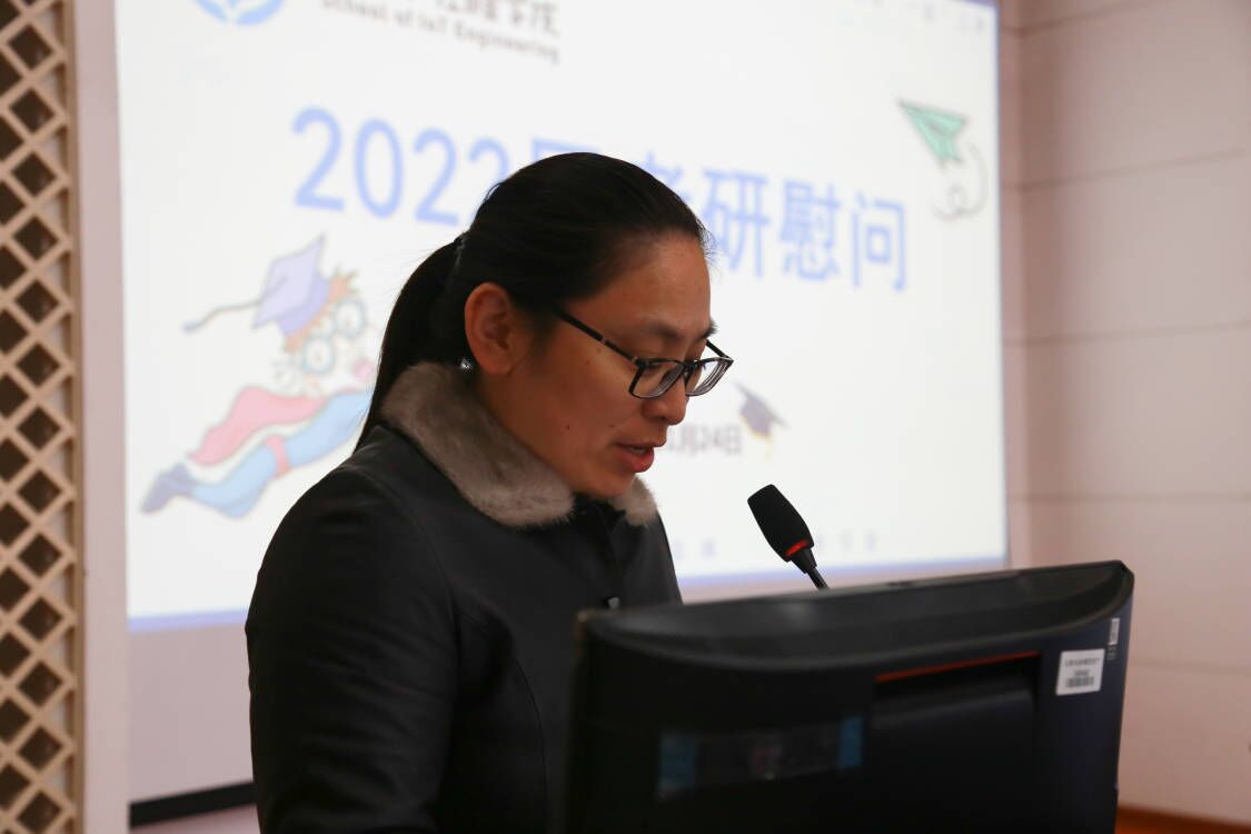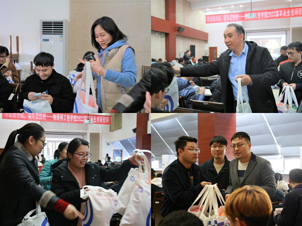 秦宁宁作为班主任代表发言。她回忆了近四年来与同学相处的珍贵点滴时光,建议同学们在考前的最后30天里合理规划时间,用心排兵布阵,卸下重担、平复焦虑,为迎战考试做好万全准备。随后,在自制考研慰问微视频《你的答案》背景音下,全体老师为同学们送上学院精心准备的“考研加油”慰问礼包——计时器象征着分秒必争、不负韶华,抱枕意味着劳逸结合、养精蓄锐,表达了学院对考研学子细致的关怀与殷切的期盼,将活动推向高潮。