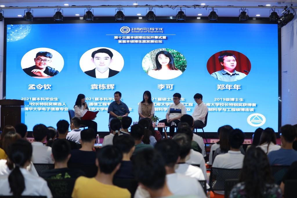 随后,首届本硕博生涯发展论坛正式开始,首场论坛邀请到校长特别奖获得者、2019级控制科学与工程博士生郑年年,考博至控制科学与工程专业、2021届硕士毕业生代表李可,以及升学至清华大学、北京大学的2021届本科毕业生代表孟令钦、袁栋辉作为论坛嘉宾;由研究生会执行主席刘畅主持。论坛嘉宾主要从为什么选择继续深造、更好的学习方式是什么、如何应对压力、以及如何适应所处的环境四个问题出发,开展圆桌讨论。大家在讨论中谈到本科生与研究生的薪资比、大学里的内卷现象、当下大学生的焦虑状态、以及高影响因子论文的发表、研究团队的氛围及研究方向等校园里的热议话题,讨论即轻松活泼、又发人深省,嘉宾们也从自我价值观、如何避免内卷、学会释放调整和适应等角度展开对话,活动中不时传来讨论声、响应声和欢笑声,形成了台上台下实时互动的轻松氛围。通过讨论,大家对规划的认识进一步提高,对保持本心和坚定方向的价值不断趋同,与会者都深受启迪。