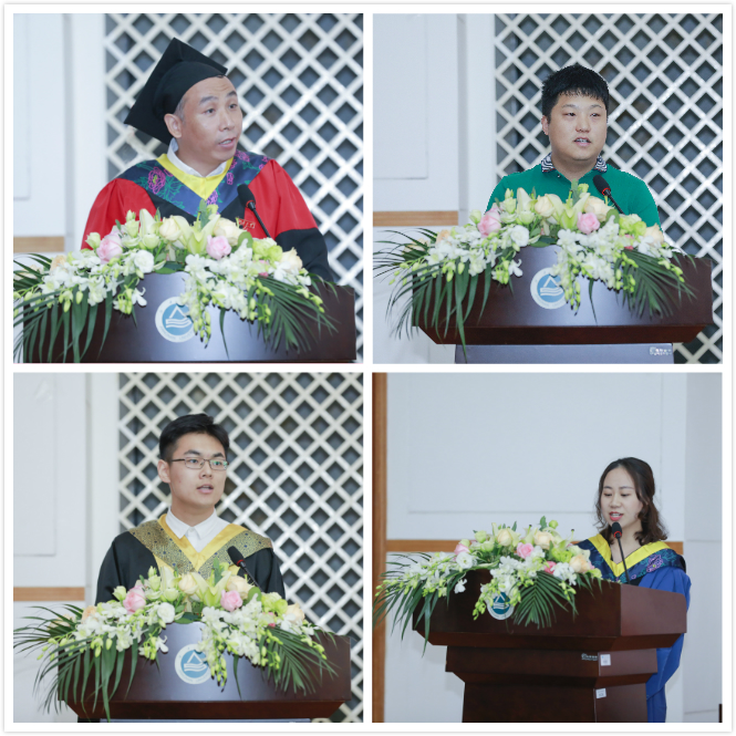 会议伊始,播放2020年毕业季宣传视频,视频由2016级本科毕业生自拍自导自演,温情记录了物联学子大学四年来在专业学习、学科竞赛、志愿服务、海外游学等各方面取得的成长及突破。随后进行典礼的第一项议程,电气1602班张超代表本科毕业生发言。他回顾了在学院求学四年的点滴时光,向辛勤培育自己的母校和老师致以诚挚的感谢,立志在今后的学习生活中将努力诠释“唯实”的院训,将奋斗铸就为青春的底色。研究生毕业生代表潘妍如分享道:“学院为我们创造了良好的学术环境,培养了我们科研创新、敢于实践的精神以及扎实的专业理论基础。我们一定要也一定能够把握好时代赋予我们的机遇与使命,继续秉持‘笃学善行止于至善’的校训,在时代的滚滚洪流中,找到属于自己的位置和方向,谱写精彩绚烂的人生,为国家和社会做出自己的贡献。”