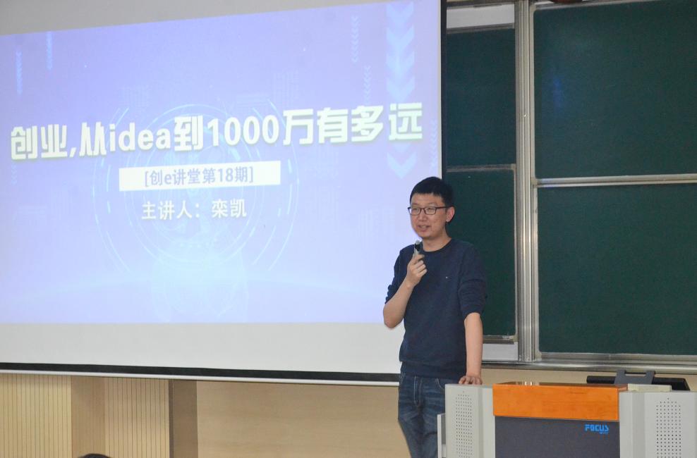 5月10日,ok138cn太阳集团529于一教B103成功开展了第18期创e讲堂活动。本次活动邀请了优秀校友栾凯作为嘉宾主讲,主题为“从idea到1000万有多远”。栾凯毕业于我校工商管理专业,是一名成功的连续创业者,现任无锡跑吧智能科技有限公司CEO。