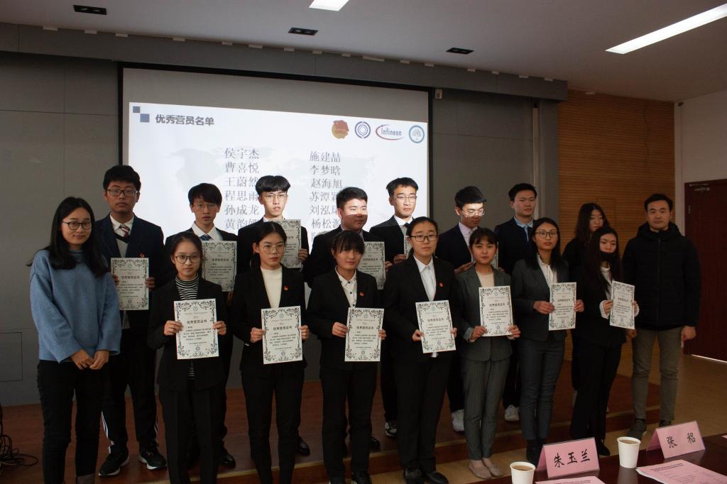 本次卓越工程师训练营还依据“优中选优,公平公正”的原则对营员进行了考核,评选出数位优秀营员。优秀营员代表孙成龙进行了获奖发言,他跟大家分享了自己在训练营中的收获与感想,同时对英飞凌公司和学院领导的支持表达了真挚的感谢。吴垚与张稆、朱玉兰向卓越工程师训练营优秀营员和“英飞凌”奖学金获奖者颁发了证书,希望借此激励物联网更多的同学向成为卓越工程师的目标努力奋斗。