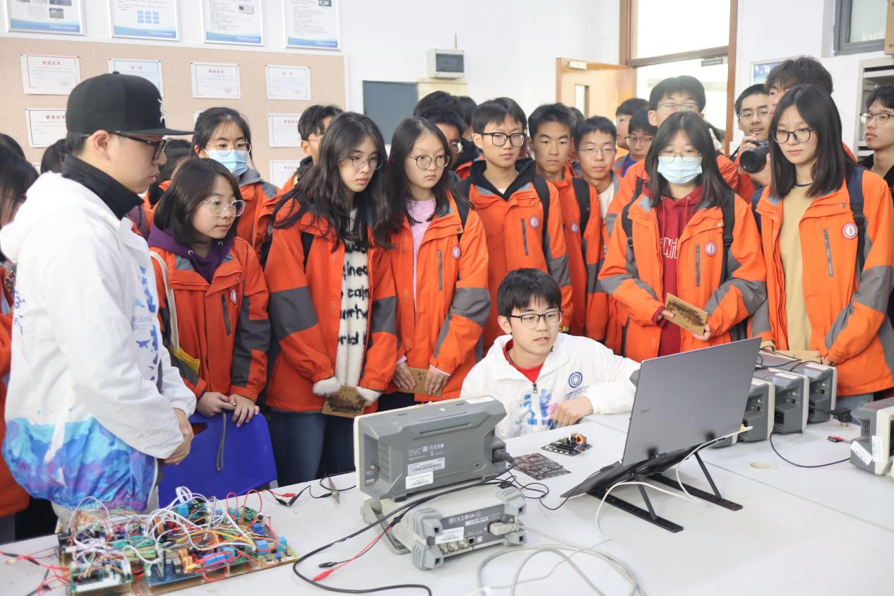 在大学生创新实践基地党支部党员的带领下,同学们沿途经过ok138cn太阳集团最高标志建筑公益图书馆,欣赏七曲桥边黑天鹅翩翩起舞,穿过曲径通幽的林间小路,来到“未来卓越工程师的摇篮”——物联网大学生创新实践基地。整个路途中,ok138cn太阳集团的秀美景色吸引了众多同学驻足停留,激起同学们对大学生活的憧憬和向往。在电子设计俱乐部,同学们依托讲解员的讲解和自身基础知识储备,认真了解面前数种功能电路的原理和组成,工程思维也在理论与实际的交汇中不断完善;在智能车俱乐部,同学们时而认真揣摩两轮车、独轮车等科创作品的工作原理,时而惊喜于作品实现的自主运行、自动避障等奇妙功能,他们不仅像海绵一样汲取知识,更能围绕其中的科学原理踊跃发言。科普研学基地为同学们提供了有趣的大疆智能车和飞行器的操作互动体验,物联网创新应用俱乐部的智慧河道项目更是帮助同学们树立了为人民谋福祉的科研初心。