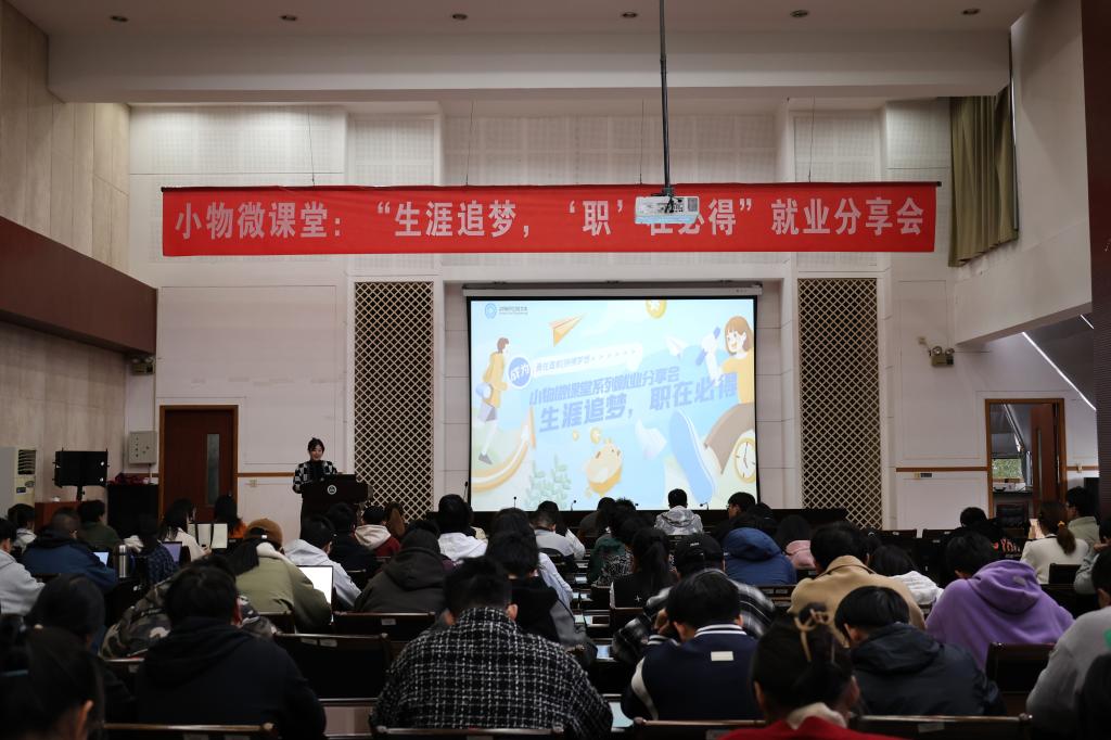 近日,“生涯追梦,‘职’在必得”小物微课堂系列就业分享会(第一期)在ok138cn太阳集团529D328会议室举行。学院党委副书记、副院长孔丽丹,高校职业生涯规划师、智能招聘(国网招聘第三方)金牌面试官何广会,就业先进典型自动化2006班孙文磊出席活动,150名物联学子参加活动。分享会由辅导员王雪冰主持。