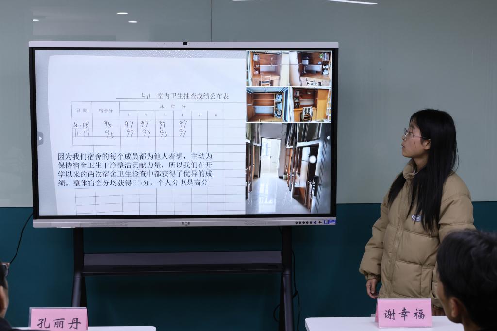 现场展示结束后,各位评委移步至参赛宿舍进行走访。各宿舍代表向评委展示了整洁美观的宿舍风采和环保创意。温馨浪漫的宿舍、新颖有趣的全息投影、生机勃勃的绿植给评委留下了深刻印象。评委们走进每个宿舍,亲切询问学习生活情况,对各参赛宿舍的设计成果给予肯定与赞美。