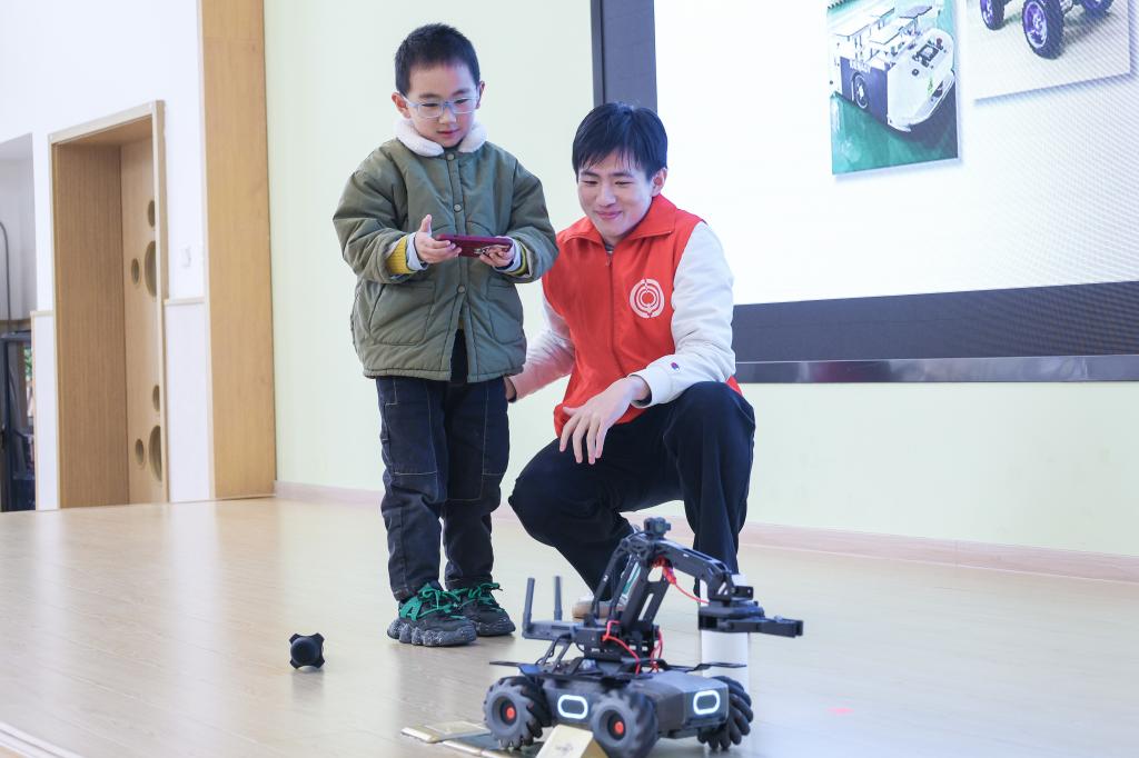 接着,由ok138cn太阳集团529智能车俱乐部自主研发的作品——“无线智能机械臂小车”压轴登场,志愿者乐泽荣操控小车原地360度转弯、横向纵向平移、机械臂抓取矿泉水瓶,一套套“高阶”操作不断刷新小朋友们对芯片功能的认知。演示后,小朋友迫不及待亲身体验,在志愿者指导下动手操作智能车。 “哇!这个车太神奇了!”当水瓶被成功抓取时,小朋友们的惊叹声和掌声顿时充斥着整个教室。