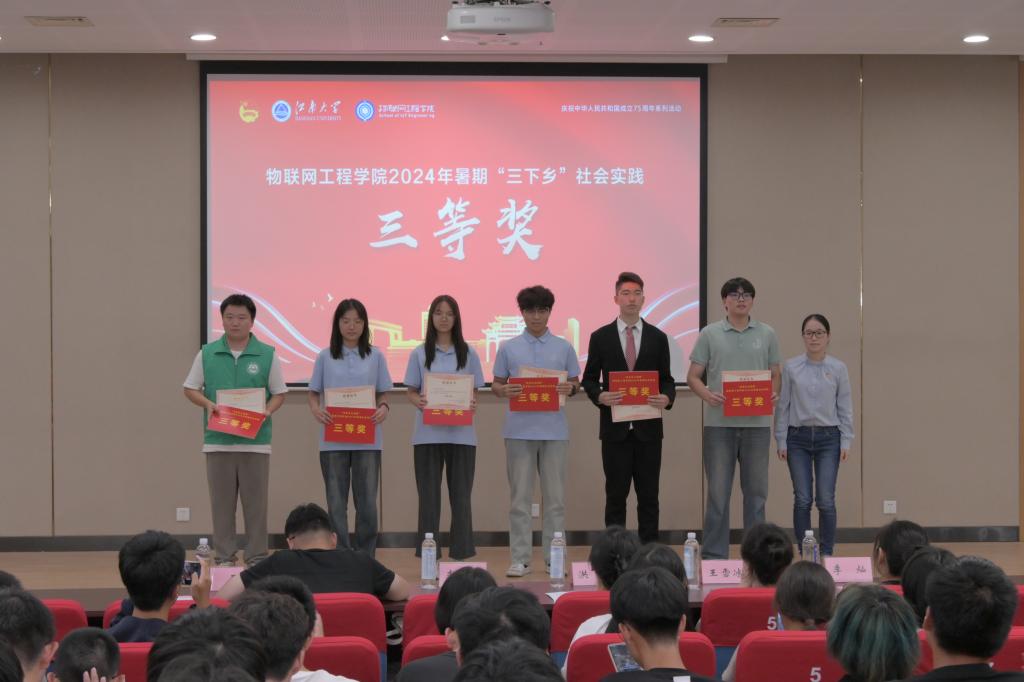 经过激烈角逐,“研”途强军行实践团荣获优秀团队一等奖,“常州三杰”薪火志愿团、“智汇同赢”科技科普实践团荣获优秀团队二等奖,“智动兴农先锋队”实践团等5支团队荣获优秀团队三等奖。吴雪等9位同学获得学院2024年暑期社会实践“先进个人”荣誉称号。现场嘉宾为获奖集体和个人代表颁发了证书。