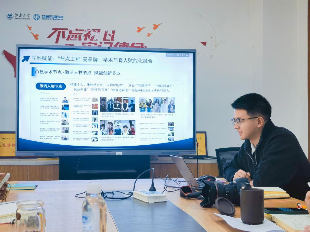 曾磊全面梳理了学院在新媒体、社会实践与志愿服务领域的创新实践。新媒体建设上,他以“I-O-T”三维体系为核心,强调通过“(Innovation)内容创新驱动、(Openness)平台开放协同与(Teamwork)团队多维赋能”推动新媒体工作深入开展,形成高效传播链条,夯筑网络育人工程,机制化高效助力学生成长成才和学院发展。社会实践方面,他通过“双向导师指导+党团骨干领衔”制度,深化专业教育与实践项目结合,构建“全面覆盖+精品培育”的项目模式,并借助校内外媒体联动实现实践成果从校级到省级、央媒的三级跃升,提升实践育人“贡献度”和“影响力”。志愿服务领域则以规范化管理与品牌化建设为双轮驱动,覆盖学术会议保障、迎新就业服务等全场景,打造“物联追锋者”宣讲团等特色品牌,构建长效参与机制,引导学生在公益活动中强化社会担当。