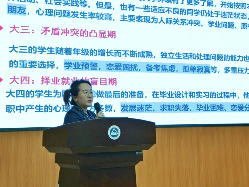 接着,学院心理辅导员张圆化身心灵引路人,围绕角色定位和工作职责、常见心理问题识别、朋辈互助技能、心理危机干预以及校内外心理援助资源等方面展开详细讲解,她聚焦心理问题线索挖掘、识别技巧及应对策略,通过理论讲授与案例解析相结合的方式,有效提升了寝室长及班级心理委员工作能力和水平。此外,张圆分享了一系列生活实用的心理保健方法,引导大家学会觉察自身情绪状态、重视自我身心关照。最后,张老师又介绍了我院心理健康教育工作站的建设情况、梳理本学期心理专题活动,引导宿舍长主动关注并投入心理主题活动,共同营造身心健康、互助友爱的校园氛围。