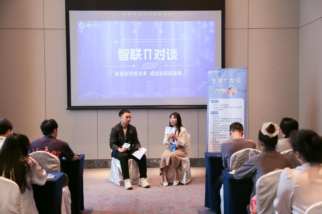 在互动环节,当被问及“读研时如何化解与导师的矛盾”时,马乐乐真诚地分享了自己的“矛盾化解两部曲”:要把导师视为科研伙伴,保持开放谦虚的沟通态度;要言之有物带着建设性方案与导师探讨。她特别提醒同学们:“情绪激动时不妨先按下暂停键,冷静后再沟通效果更佳。”这番推心置腹的分享让在场同学受益匪浅。本期智联π对谈活动也在欢声笑语中圆满落幕。