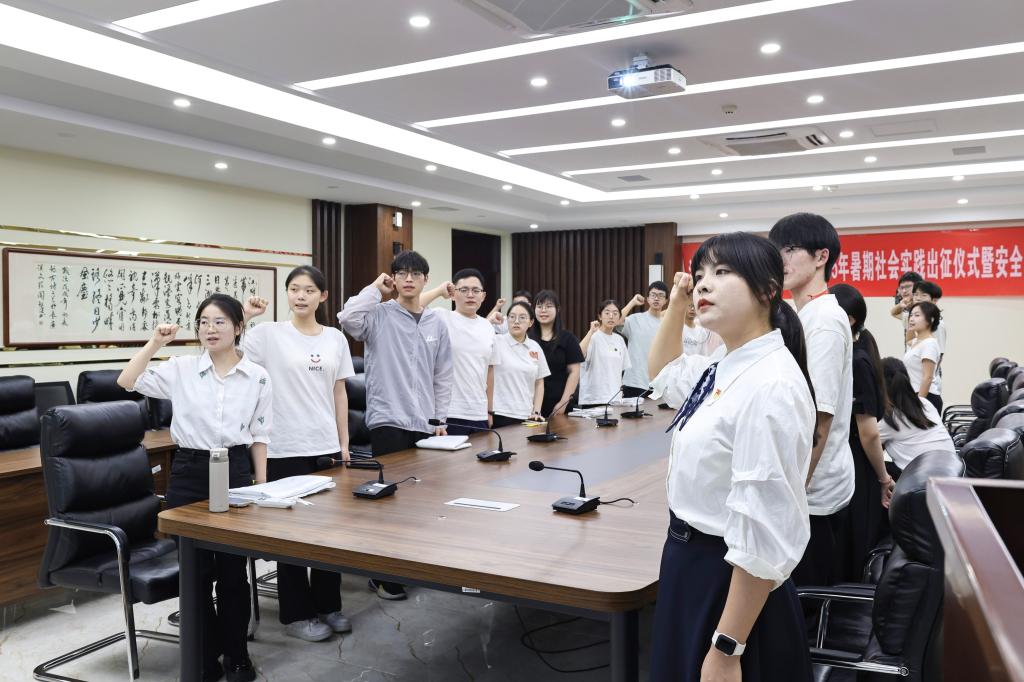 授旗和宣誓环节,吴妍为14支暑期社会实践重点团队授旗,吴雪带领全体实践团进行出征前宣誓,坚定表达了服务社会、锤炼本领、砥砺成长的青春誓言与使命担当。
