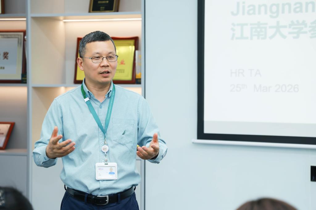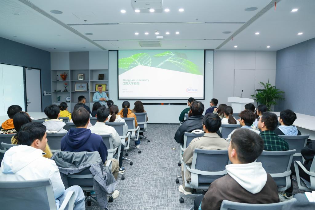 活动伊始,郁海金对自动化与智能科学学院(物联网学院)师生一行表示热烈欢迎。他围绕企业架构、核心业务、明星产品以及独特的企业文化展开全面介绍,彰显了英飞凌在全球功率系统和物联网领域作为半导体领导者的行业地位。随后,周敏芳以企业发展脉络为引,系统介绍了公司在功率半导体、物联网解决方案等领域的全球领先地位,拆解了从芯片研发到终端应用的完整业务链条,让同学们直观感受半导体技术对新能源、智能硬件等领域的核心支撑作用。