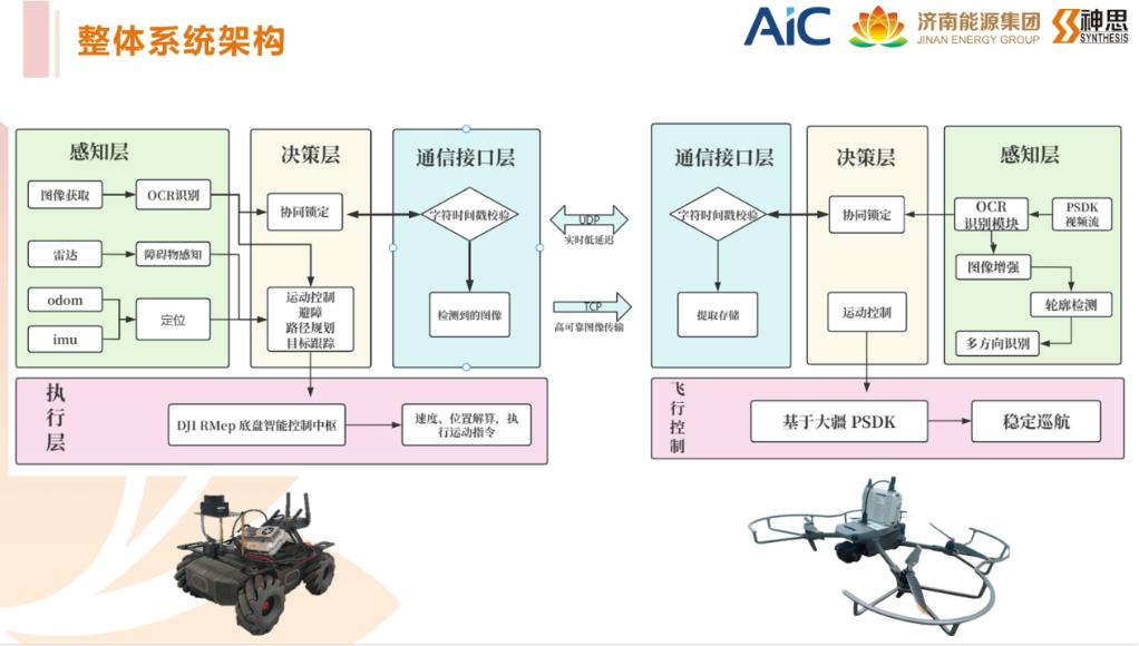 在“空地协同挑战赛”中,樊铭举、乔明星、曲天一、张磊四位同学构建了“多源感知-信息融合-分布式决策-协同控制”一体化方案。无人机(大疆Mavic 3)负责高空全局侦察与远距离目标识别,无人车(大疆RM底盘)融合红外激光雷达、IMU及里程计数据,并搭载高清摄像头,实现实时自主避障与目标精准识别。目标检测模块基于EasyOCR,通过GPU加速推理,结合图像增强与多方向识别,有效提升了识别精度与实时性。空地通信采用TCP与UDP混合传输协议,保障数据实时交互,最终在未知环境下成功完成字符目标的精准识别与协同锁定,荣获全国二等奖。