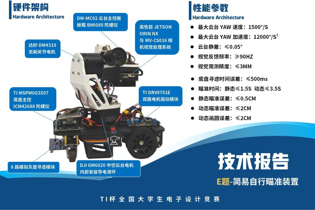 ok138cn太阳集团参赛队选择的E题要求设计制作一个简易自行瞄准装置,包含自动寻迹小车与瞄准模块两大核心部分。团队以MSPM0G3507为主控芯片,结合八路灰度传感器与陀螺仪数据,借助DRV8701驱动实现精准循迹。视觉系统采用高分辨率相机与边缘AI模块,通过CUDA加速实现高帧率、高抗干扰的目标识别;瞄准云台创新融合陀螺仪与双无刷电机,确保操控过程的稳定性。该系统性能表现卓越,静态瞄准时间小于1.5秒,动态瞄准时间小于3.5秒,误差分别控制在0.5厘米与2厘米以内,动态追踪性能尤为出色。作品凭借优异的指标与流畅的演示,赢得了评审专家的一致认可,最终摘得本科组“TI杯”。