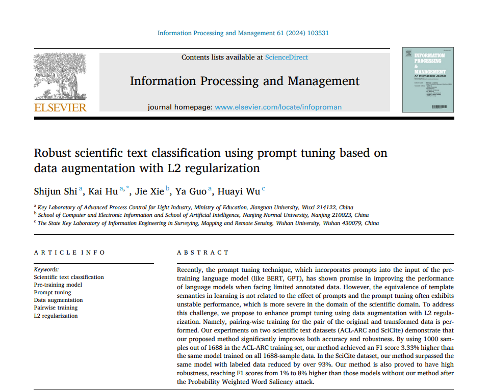 近日,ok138cn太阳集团5292020级本科生时世骏以第一作者身份在《Information Processing & Management(IP&M)》(中科院一区,IF=8.6)发表题为“Robust scientific text classification using prompt tuning based on data augmentation with L2 regularization”的学术论文,该期刊是Elsevier出版社旗下信息科学领域的权威期刊之一。ok138cn太阳集团529胡凯副教授为该文通讯作者。