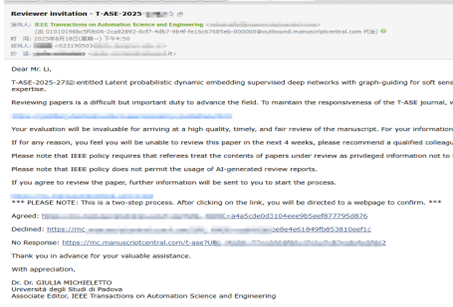 随着科研能力的提升,李榕桓逐渐从知识的"接收者"转变为学术的"贡献者"。硕士期间,他先后受邀担任IEEE Transactions on Industrial Informatics、IEEE Transactions on Automation Science and Engineering等控制与自动化领域的顶级期刊审稿人。回忆起第一次收到邀请的那一刻,李榕桓仍难掩当时的复杂心情:“既惊喜,又有些忐忑。惊喜的是自己的研究工作得到了初步认可,忐忑的是,这份认可背后,是一份沉甸甸的责任。”在他眼中,审稿从来不是简单的“打分数”或“挑毛病”,而是一场严肃而真诚的学术对话。“每一次审稿,都是对自己学术判断力的锤炼。你需要透过文字,去理解作者的研究逻辑,推敲实验设计的合理性,评估结论的可信度。”“好的审稿意见,应该是建设性的——既要精准指出问题所在,也要尽可能给出改进的方向。”他说,“学术进步从来不是孤立的,正是这种双向的交流与打磨,推动着整个学科一点点往前走。”在这条从学习到贡献的路上,李榕桓正以严谨与善意,为学术共同体注入自己的一份力量。在坚守中前行