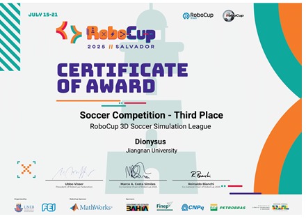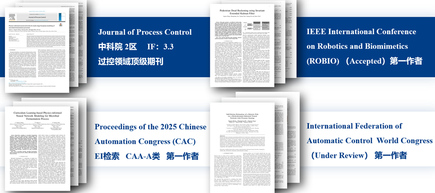 首先,他牵头重构杂乱代码,明确模块边界与规范,将代码库打磨成可迭代、可维护的标准体系;搭建稳定训练脚本与问题定位机制,摒弃凭经验调试的粗放模式,实现“用数据说话”,让每一次优化都有据可依。其次,他建立了量化评估与常态化复盘制度,针对性补齐团队短板,引入强化学习技术,在数万次模拟对抗中迭代策略,打磨出15米大脚传球等稳定战术。同时,他主动对接国内外强队,借鉴成熟经验并本土化优化,帮团队少走弯路;更着眼长远传承,把核心经验整理成规范手册,打破“骨干毕业即断层”的恶性循环,让新人能站在既有基础上快速成长。体系成型后,成绩水到渠成。团队斩获2025RoboCup机器人世界杯世界季军、2024巴西赛世界第六,连续两年拿下中国机器人大赛暨RoboCup机器人世界杯中国赛一等奖,让濒临解散的队伍重回国际赛场。对他而言,成绩是理念的验证,唯有方法可复现、流程可迭代、团队可持续,才能稳步破局。他更没有停下科研探索的脚步,将竞赛中培养的问题意识与工程思维,无缝延伸到学术研究中。截至目前,他已发表过程控制领域SCI期刊论文2篇、EI会议论文2篇,累计发表高水平论文5篇,另有2篇论文在投,实现了竞赛与科研的双丰收。