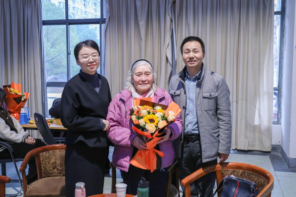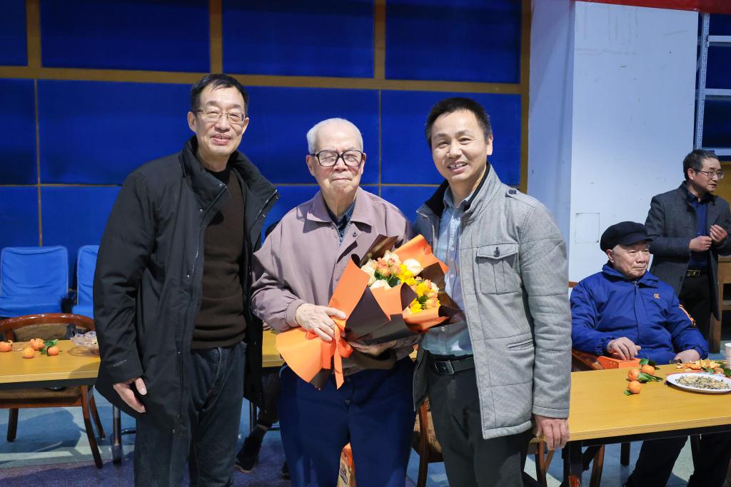 团拜环节,学院领导班子向辛勤付出的广大教职工表示慰问,将真情实意化作诚挚祝福,祝愿全体同仁在新的一年里与学院事业同频共振、蒸蒸日上。紧接着,学院领导为年逾九十的张斯湜老师、黄学祥老师奉上鲜花。