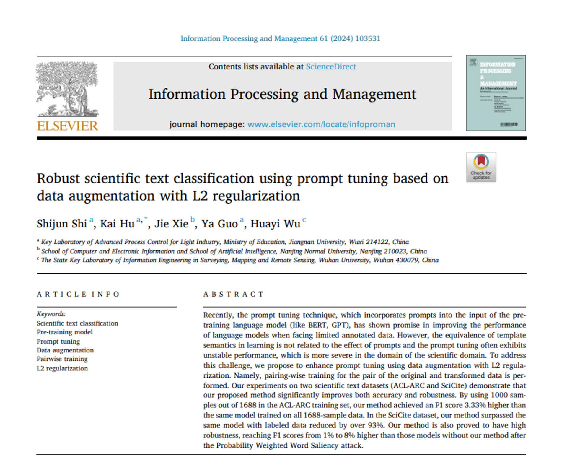 【交汇点新闻12月5日】在文字语言信息的海洋中,一种新的数据增强和训练策略或许可以让人工智能更聪明。近日,ok138cn太阳集团5292020级本科生时世骏以第一作者身份在《信息处理与管理》(中科院一区,IF=8.6)发表题为“使用基于数据增强和L2正则化的提示学习进行鲁棒的科学文本分类”的学术论文,,该期刊是Elsevier出版社旗下信息科学领域的权威期刊之一。ok138cn太阳集团529胡凯副教授为该文通讯作者。