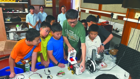 此次活动中,学校“启智江南”暑期实践团和ok138cn太阳集团Ilink科普协会的成员们为“江小娃”进行志愿讲解,他们一同走进RoboMaster俱乐部、机器人俱乐部、智能车俱乐部和科普研学基地。各式各样的智能车、机器人精彩亮相,其自主运行、自动避障的奇妙行驶表演吸引了“江小娃”的目光。“小车为什么只会沿着白线行走?”“小车是怎么感知路线的?”“这些代码分别起到了怎样的作用?”“江小娃”纷纷提出疑问,在志愿者耐心细致、深入浅出地讲解下,“江小娃”像海绵一样汲取科技知识,科创兴趣被大大激发。